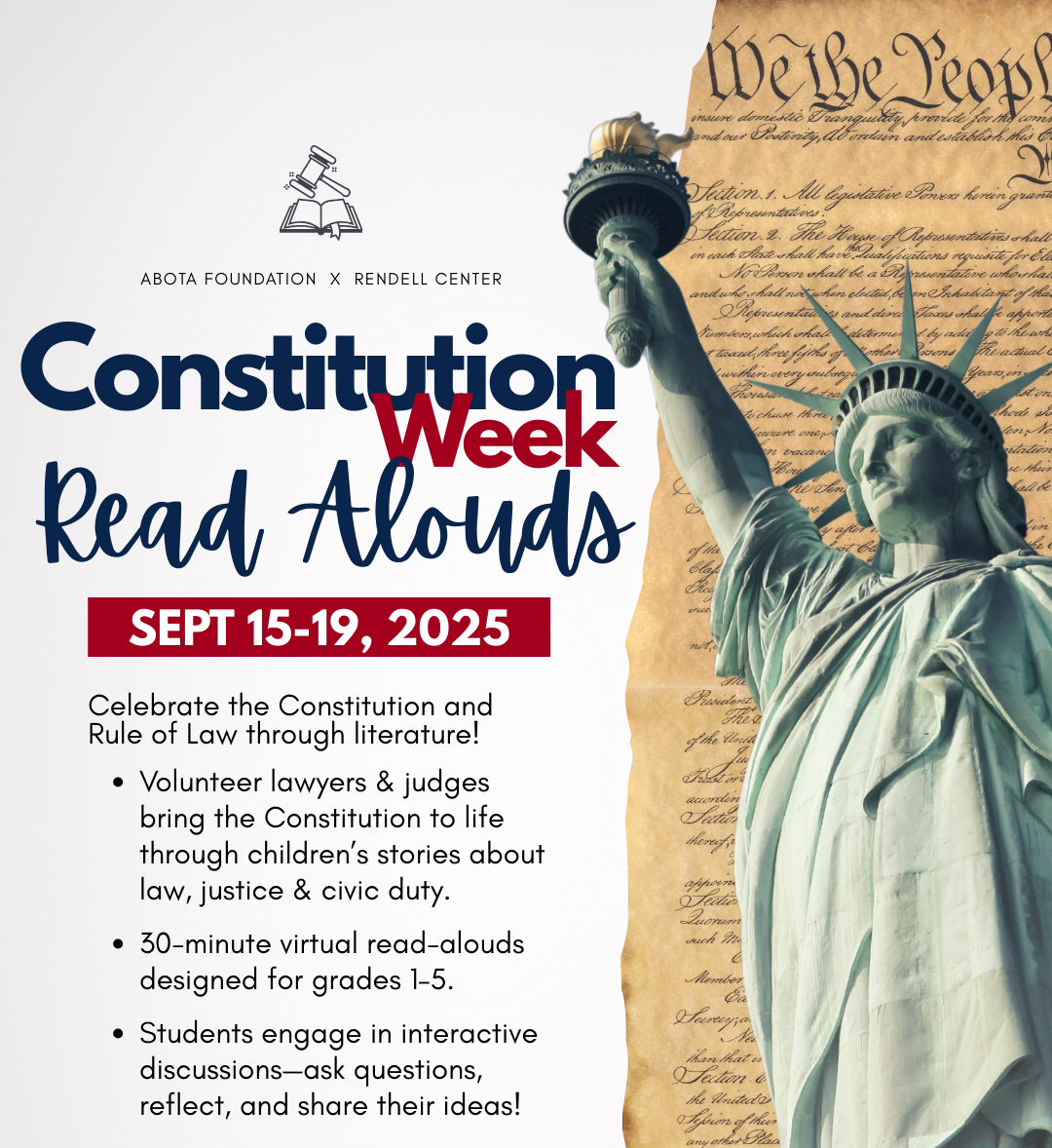 The ABOTA Foundation is partnering up with the Rendell Center for 2025-2026 Read Alouds! This FREE program allows teachers to bring in lawyers and judges into their classroom (in-person or virtually) to teach the importance of civics education to students through literacy!